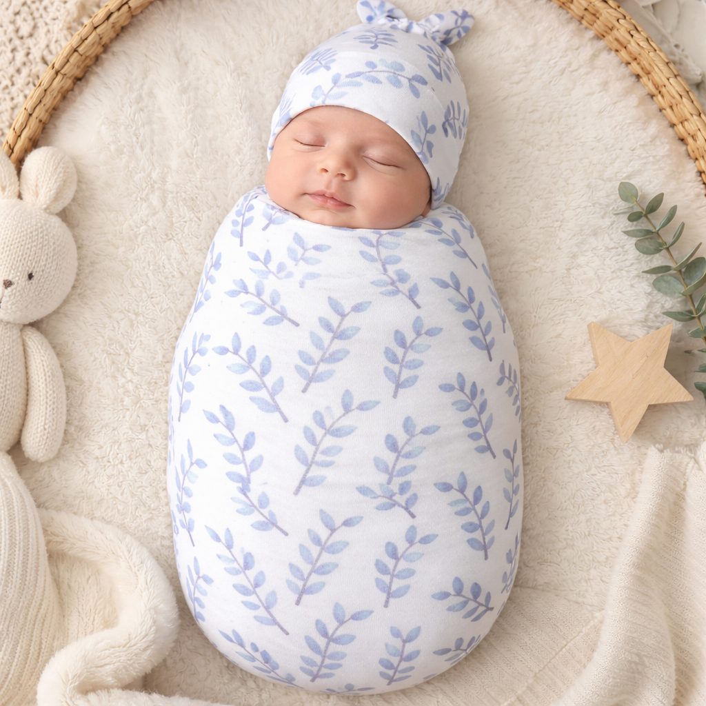 Be the first to review “Blue Leaves Swaddle & Beanie Set”