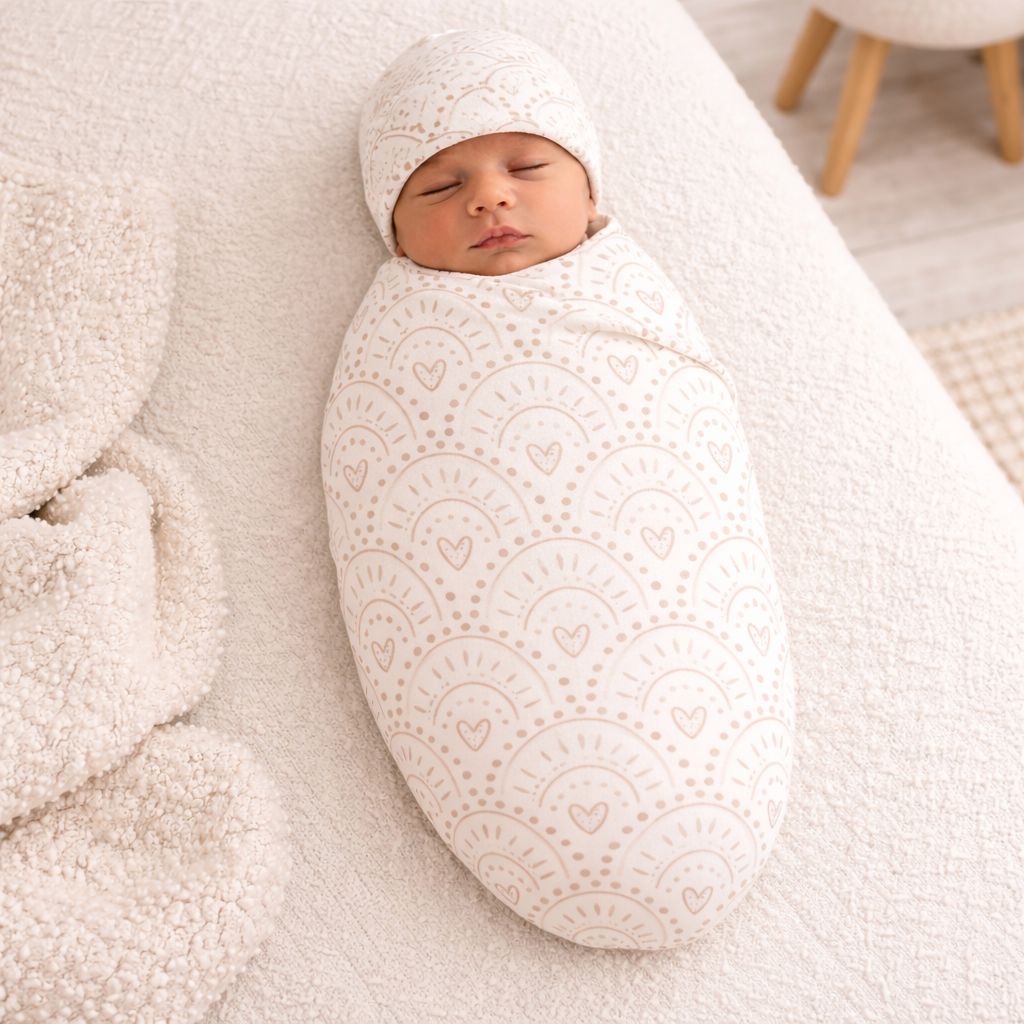 Our swaddles and beanies are made from a luxuriously soft jersey knit fabric that is brushed on both sides, and feels amazing against the skin. With just the perfect amount of stretch, swaddling baby is a breeze, while keeping comfort as a top priority.