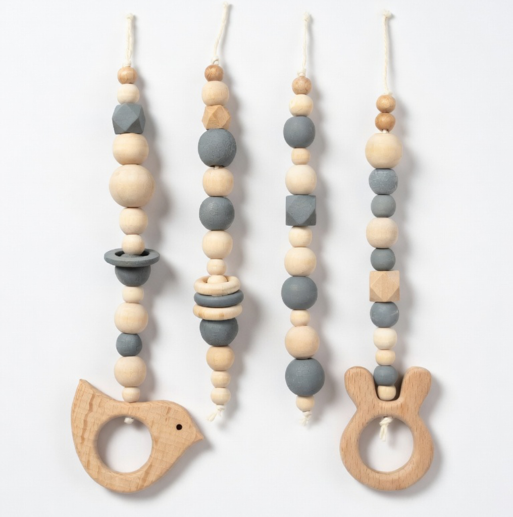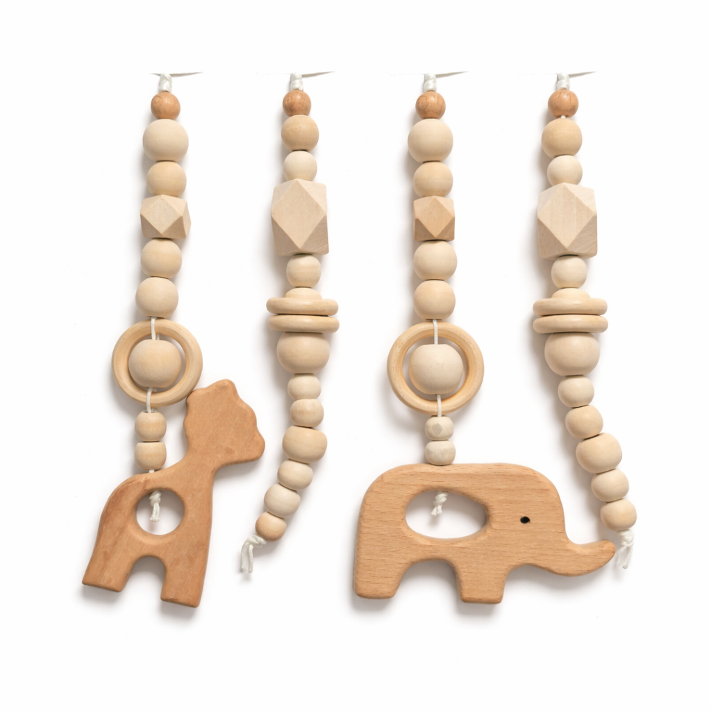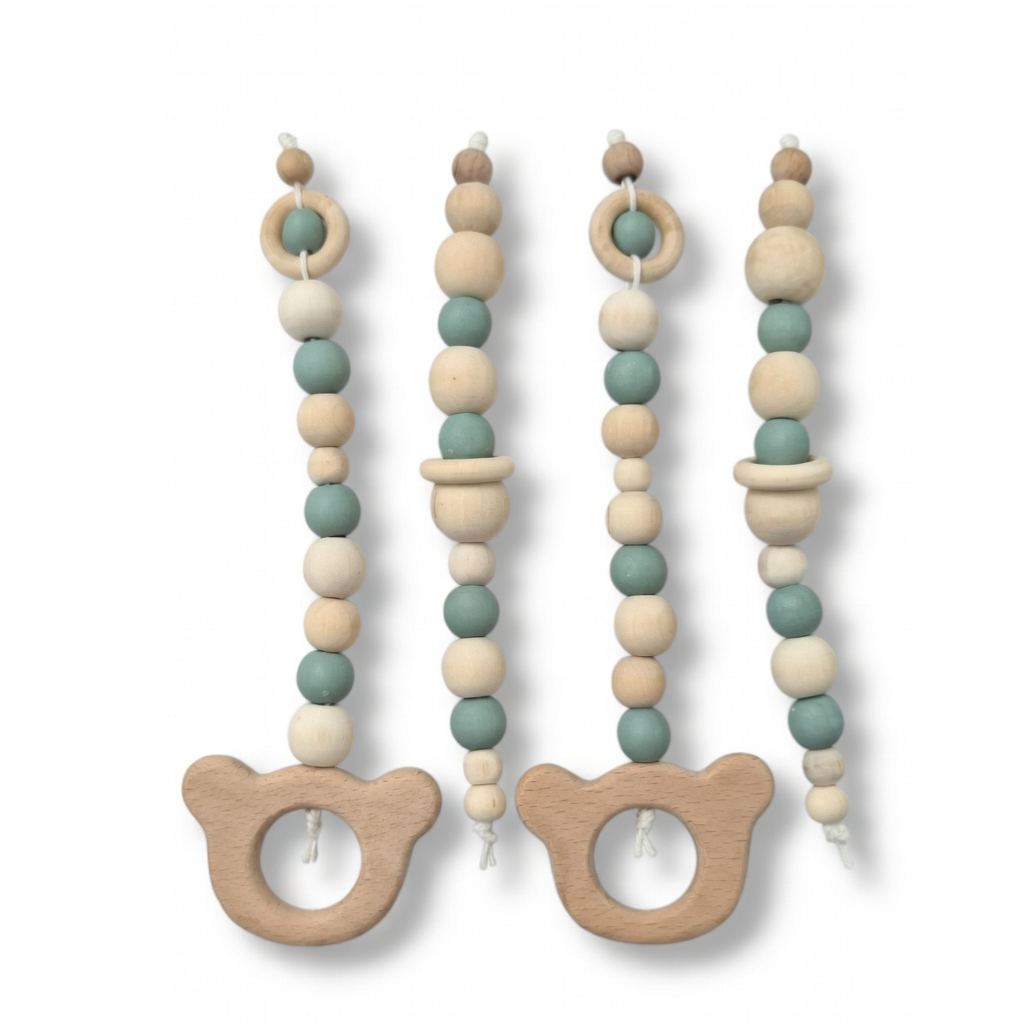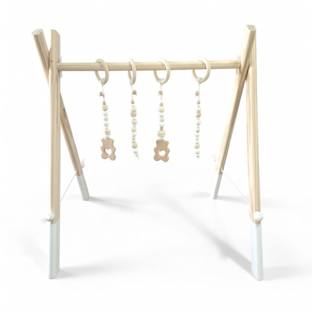 Wooden Baby Playgym. For hours of stimulation with natural beads and pretty dangle toys to keep baby occupied and interested. Choose any dangle set you like. Each playgym comes with a connector piece to hang your dangles on. This way you don’t have to take the whole playgym apart to switch out toys! Smart right?