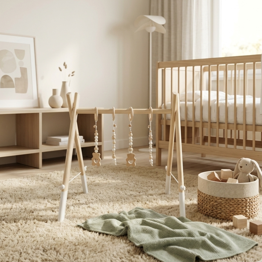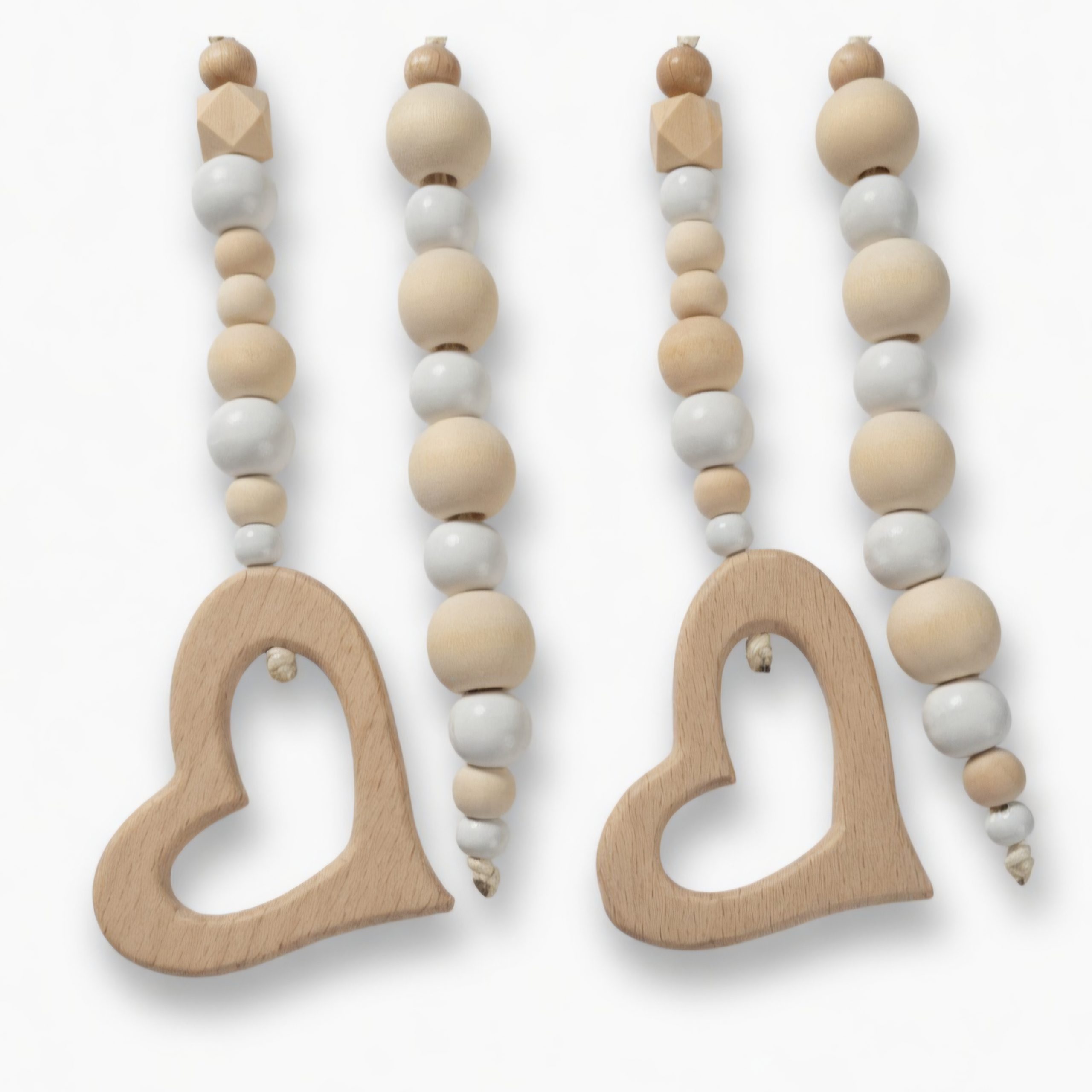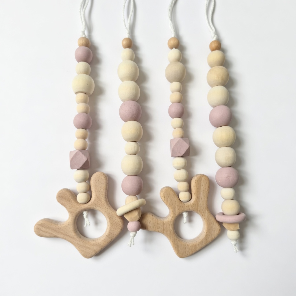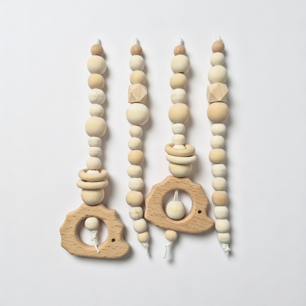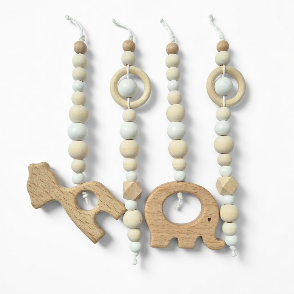 Wooden Baby Playgym. For hours of stimulation with natural beads and pretty dangle toys to keep baby occupied and interested. Choose any dangle set you like. Each playgym comes with a connector piece to hang your dangles on. This way you don’t have to take the whole playgym apart to switch out toys! Smart right?